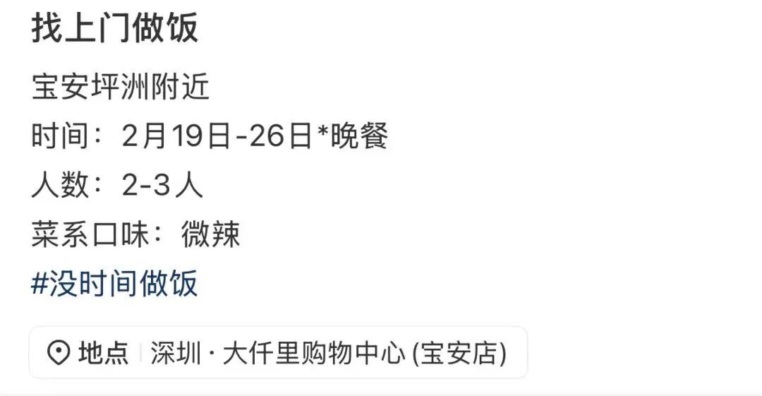 在深圳,有不少人选择在社交平台发布相关内容,请人上门做饭。