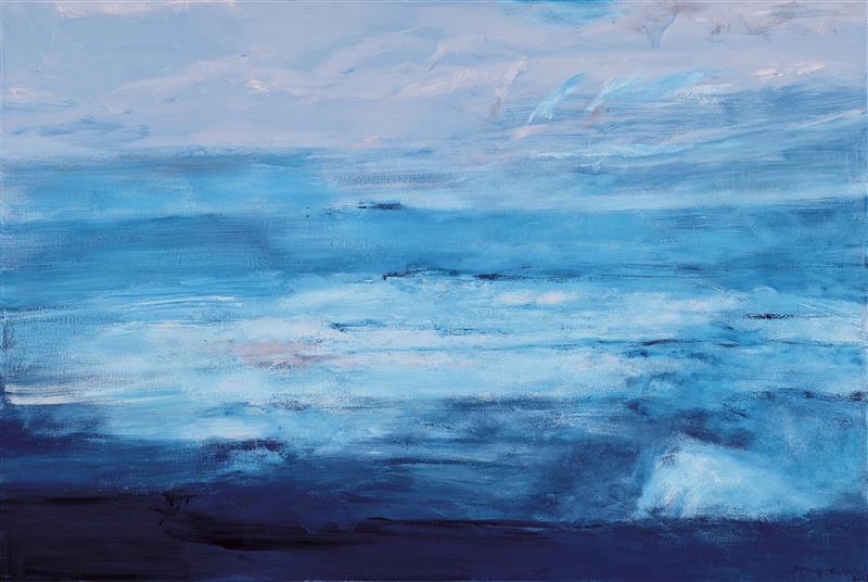 亮点作品之一赵无极的《皇宫酒店之夜》,呈现出大西洋海岸的辽阔景致与艺术家超然的艺术境界。作品创作于2004年,是赵无极晚期创作的一个重要时段。在这段时期,他的作品更加注重色彩和形式的交融,逐渐展现出更为深邃的哲学思考,尤其是对自然与宇宙的感悟。