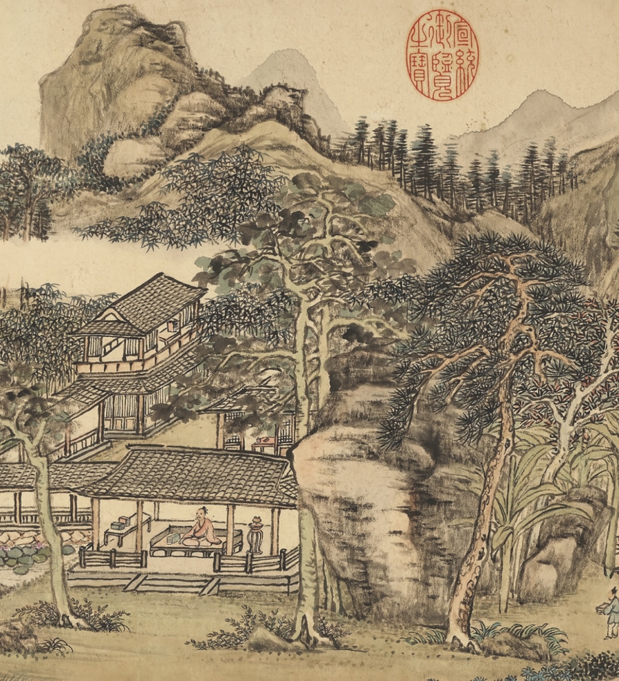 另一亮点之作是张宗苍的《梧馆新秋》,以墨色层染勾勒江南禅境,笔触间尽显宫廷绘画的极致工笔,一叶知秋,意境幽远,仿佛将整个姑苏的秋凝于画布上。